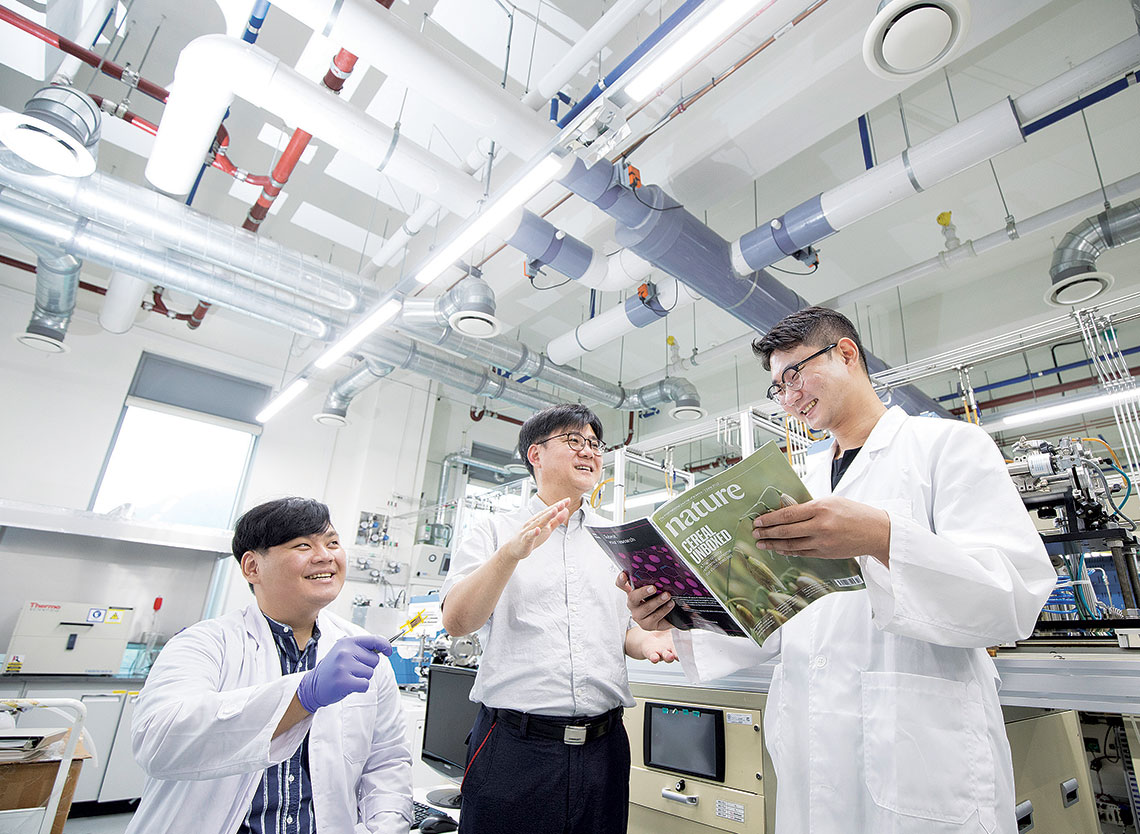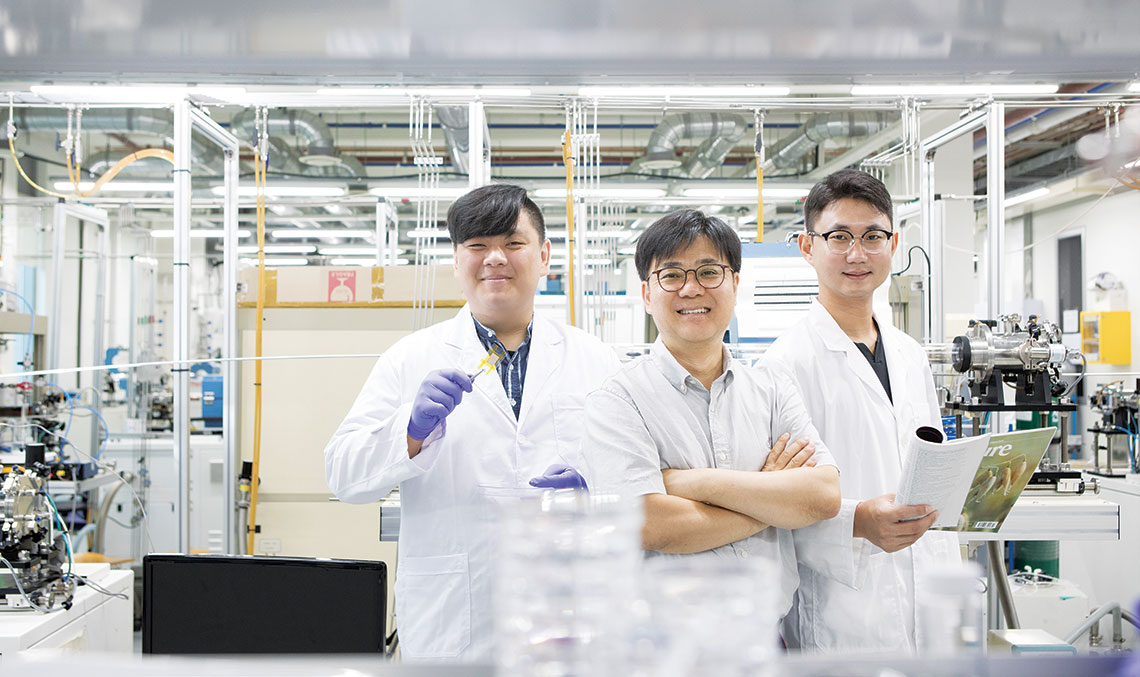 From the left, Hyeong Joon Kim (Ph.D. candidate), Professor Hyun Seok Shin, and Min Soo Kim (Ph.D. candidate)
