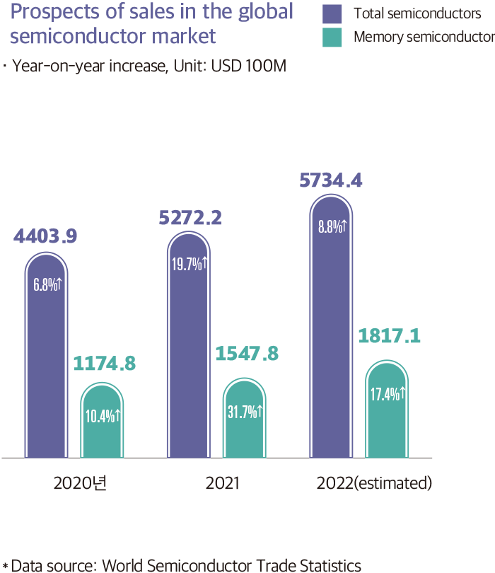 Meanwhile, the proportion of the semiconductor industry in South Korea has increased further. According to the Ministry of Trade, Industry, and Energy, nationwide exports as of 2021 reached KRW 644.54 billion, an increase of 25.8% compared to 2020. This is the largest export performance since 1956 when trade statistics began to be recorded. The exports in semiconductors also recorded their highest in history. The exports in semiconductors in 2021 stood at KRW 128 billion, an increase of 29% compared to 2020. This outcome was possible because our semiconductor industry has a competitive edge in manufacturing and production. However, we need an overall transformation in the long run. The semiconductor industry plays a large role of economic globalization, which is characterized by the international division of labor. The number of partners that deliver goods to a semiconductor company in the U.S. tallies 16,000, with more than half of them being overseas companies. This means that we need to broaden our horizons to not only manufacturing but also all stages of the semiconductor processes. The “K Semiconductor Strategy” was established at the national level in May last year, and aims to build a highly efficient industrial complex that integrates semiconductor production, raw materials, parts, equipment, advanced devices, and design at scale. The ongoing investment and efforts should be supported for South Korea to forge ahead to secure the largest market and production base in the global semiconductor industry and build a reliable and leading global semiconductor supply chain in the future.
