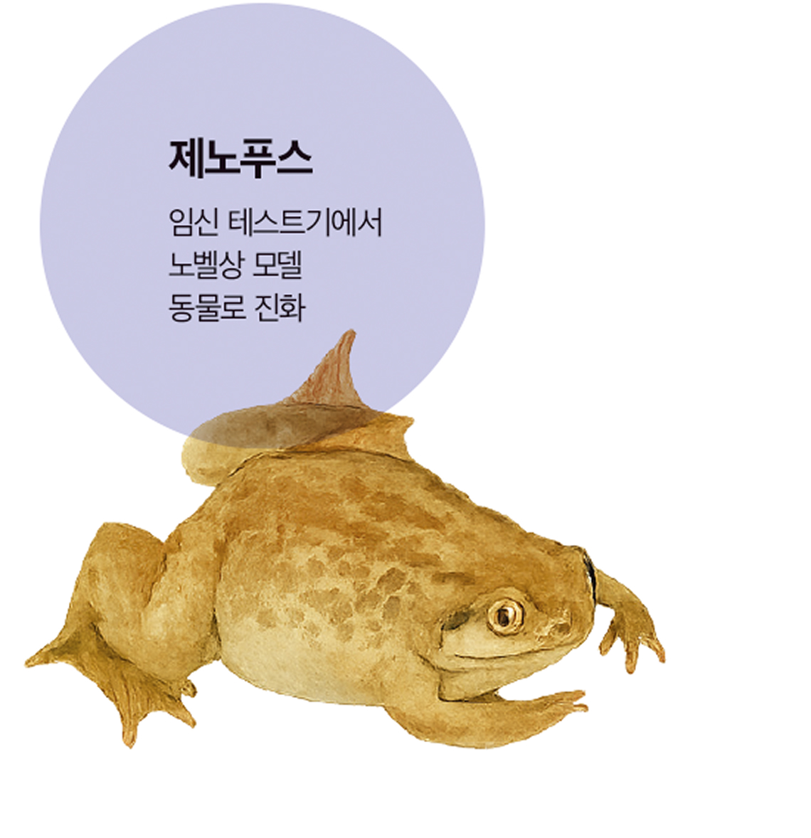 임신 테스트기에서 노벨상 연구의 주인공으로까지 진화한 동물이 있다. 아프리카발톱개구리(Xenopus laevis)로 불리는 제노푸스다. 발가락 끝에 발톱이 달려 있어 이런 이름이 붙었다. 연구자들이 제노푸스를 선호하는 이유는 알이 유난히 크고 단단해서 다루기 쉽다는 점이다. 게다가 암컷이 한 번에 수천 개의 알을 낳으니 대량 실험도 거뜬하다. 수정란이 체외에서 발달하기 때문에 배아가 분열하고 올챙이가 자라는 과정을 그대로 관찰할 수 있다는 것도 큰 장점이다. 흥미로운 점은 제노푸스가 한때 ‘살아 있는 임신 테스트기’로 쓰였다는 사실이다. 지금처럼 간단한 면역학적 임신진단 키트가 없던 20세기 중반까지 여성들은 임신 여부를 확인하려고 소변을 이 개구리 등에 주사했다. 임신한 여성의 소변에는 hCG라는 호르몬이 들어 있는데, 이 호르몬이 개구리 난소를 자극해 알을 낳게 만드는 원리다. 주사를 맞은 개구리가 하루 만에 알을 낳으면 ‘임신’으로 판정했다. 당시 수백만 마리의 제노푸스가 전 세계로 퍼져나갔고, 덕분에 오늘날에도 발생학 연구의 대표 동물이 될 수 있었다.