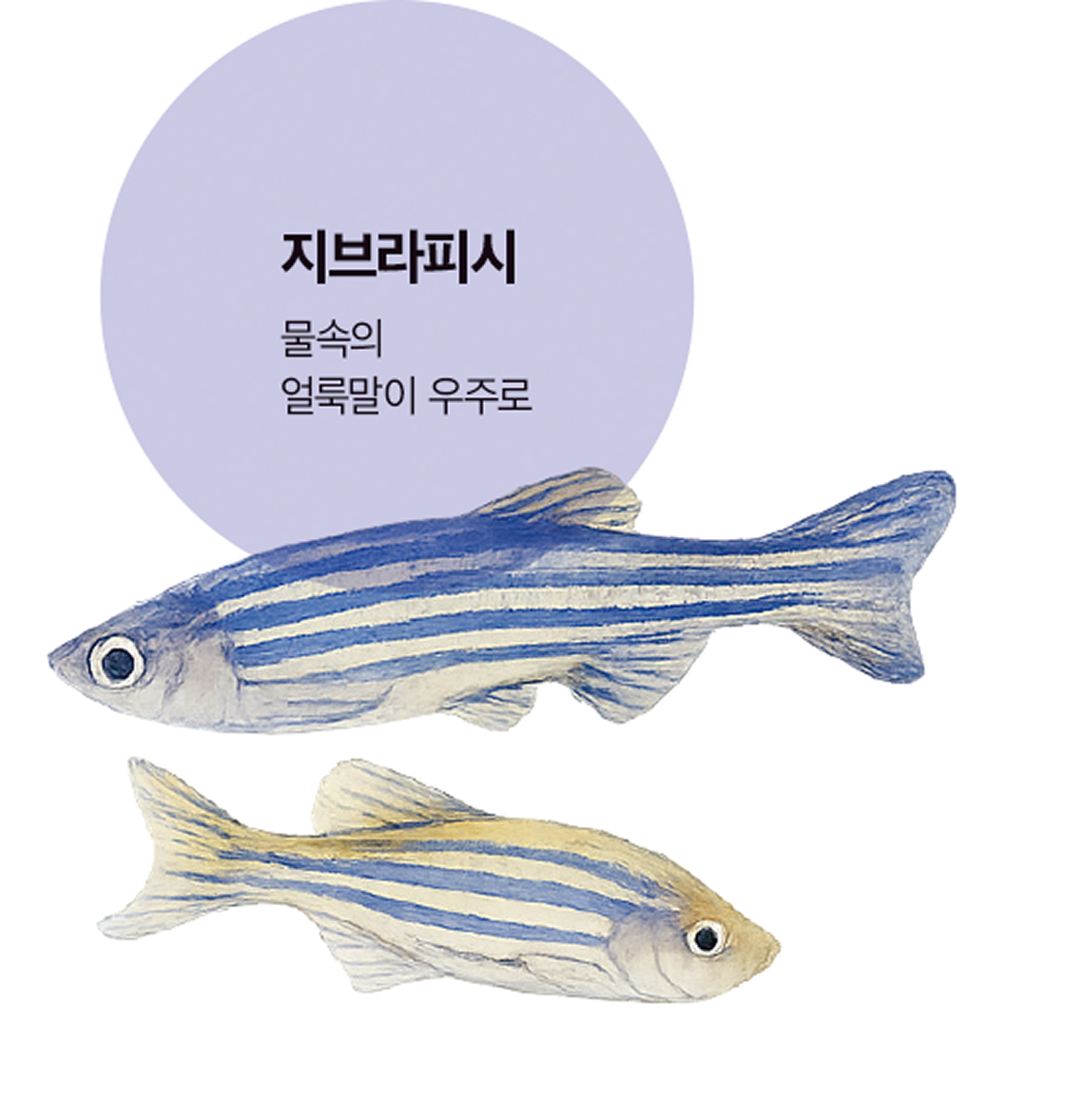 몸에 줄무늬가 있어 ‘물속 얼룩말’로 불리는 지브라피시(Zebrafish)는 투명한 알 덕분에 심장이 뛰기 시작하는 순간, 혈관이 자라는 모습을 직접 볼 수 있다. 사람과 유전자의 70% 이상을 공유하기 때문에 선천성 심장질환이나 혈관 질환 연구에 널리 활용된다.