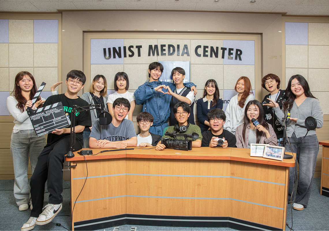 UNIST 본관 B107호. ‘Media Center’라는 이름이 선명히 붙어 있는 이곳은 유니스테이션(UNISTATION: UNIST Broadcasting Station)의 편집실이다. 단순한 동아리가 아닌, 학교의 시간을 기록하고 표현하는 방송국이며, 유니스트의 꿈을 함께 꾸고 그 숨결을 담아내는 뜨거운 심장들이 뛰는 공간이다. ‘영상, 라디오, 콘텐츠 하면 떠오르는 곳이 유니스테이션’이라는 말이 있을 만큼, 이들은 이미 학교 곳곳에서 신뢰받는 존재라고 한다. 입학 홍보 영상이나 비전 선포식 같은 굵직한 행사에서 제작을 맡아왔고, 그 결과물은 종종 UNIST 공식 채널에 게시되고 있다. 입학팀, 리더십센터 등 학내 주요 부서가 외주를 맡길 정도로 전문성을 인정받은 셈이다.