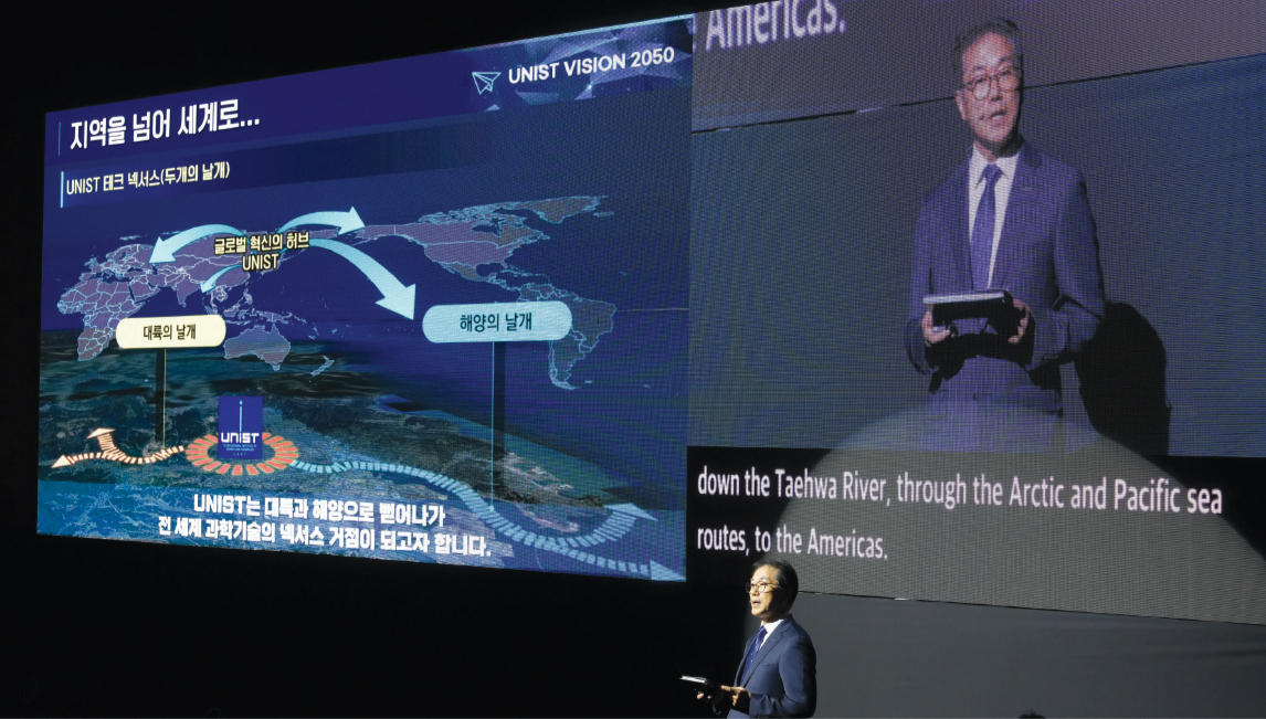 핵심 문구는 ‘UNIque & beST 과학기술 Nexus.’ 이는 단순히 세계 대학 순위 몇 위를 목표로 삼는 차원이 아니라, UNIST만의 독창성과 강점을 바탕으로 인류와 지구의 지속가능성을 높이는 대체 불가적 존재가 되겠다는 의지다.