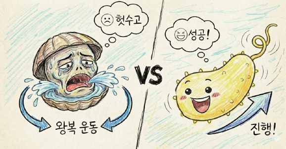 조금 더 안타까운 상황을 상상해 보자. 미시세계에 존재하는 조개가 입을 닫으며 물을 밀어내는 추진력으로 움직였다. 조개가 다음에 할 수 있는 일은 다시 입을 여는 것뿐이다. 그런데 입을 열면 물이 다시 빨려 들어가고, 조개는 입을 닫을 때와는 반대 방향으로 움직이게 된다. 입을 여닫는 미시세계의 조개는 제자리에서 반복 운동만 할 수 있을 뿐 어디로도 갈 수 없다. 입을 조심조심 천천히 열면 어떨까? 소용없다. 먹이를 배 속에 넣을 수 없었던 새끼 물고기의 경우처럼, 비디오를 거꾸로 재생하는 듯 제자리로 돌아온다. 영원히 언덕을 오르내려야 하는 시시포스처럼 말이다. 이것이 에드워드 퍼셀(Edward M. Purcell)이 1977년에 제시한 ‘조개 정리(Scallop Theorem)’이다. 참고로 퍼셀은 1952년 핵자기공명 발견의 공로로 노벨 물리학상을 받았으며, 조개 정리 외에도 수많은 업적을 남겼다.